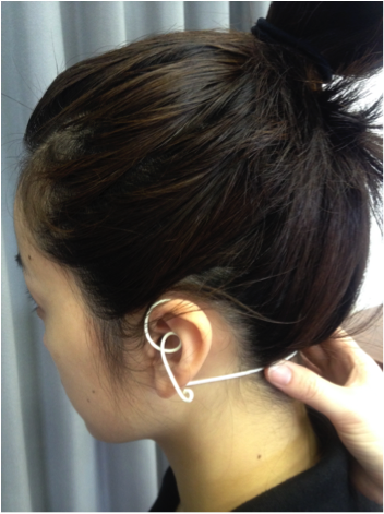 後頭部の中心にワイヤーの中心を当て【写真3】、頭の輪郭にワイヤーをぴったり沿わせて耳たぶの下まで持って行き、耳の形に沿うように耳輪を通して耳のくぼみ(三角窩と呼ばれる部分)まで型取りします。【写真4】