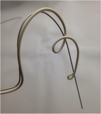 右耳の先端から熱収縮チューブを通し、真ん中まで通ったら熱収縮チューブを切断します。その際、ステンレスバネ線の先端に熱収縮チューブが当たると容易に破けてしまうので気を付けながら通します。