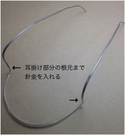 工程2で取ったデザインワイヤーの型に合わせて、耳の窪みに入る部分の針金を曲げ、余分な針金は切り落とします。型として使用したデザインワイヤーは廃棄します。【写真15】