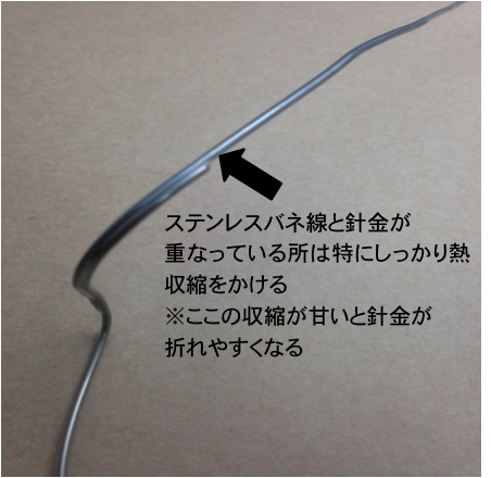 熱収縮チューブを切る長さは、ステンレスバネ線の先端よりも10cm程度長めに取ってから切ります。これは曲がる針金を通す長さを取っておくためです。