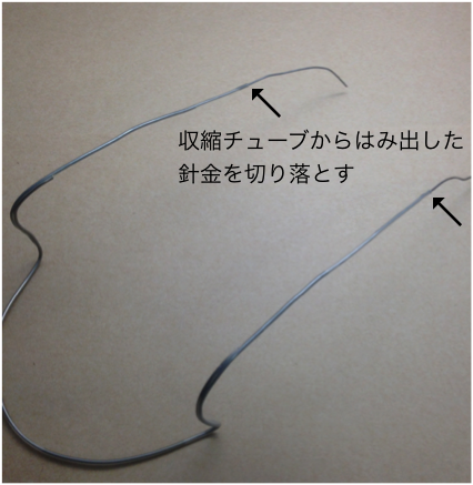 ステンレスバネ線の両耳のおおよそてっぺん部分をニッパーで切り落とし【写真9】、1.5Φの熱収縮チューブを両端から通します。