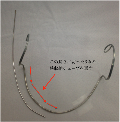 後頭部中心から口元までの長さに切ったステンレスバネ線を、1で通した3Φの熱収縮チューブの中に通し、ヒートガンで収縮させます。【写真23】